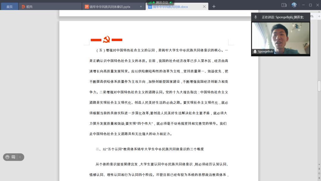 2019级自动化二班郭英奎同学在腾讯会议上主持团日活动,对中华民族共同体意识进行解读,让同学们深刻认识到中华民族共同体意识是国家统一之基、民族团结之本、精神力量之魂,对于国家统一、民族团结具有重要意义,是维护国家统一的思想基础,是促进民族团结的必要条件,是实现中华民族伟大复兴的必然要求。