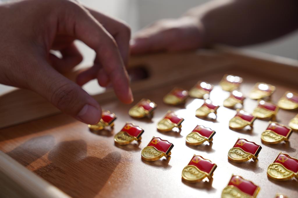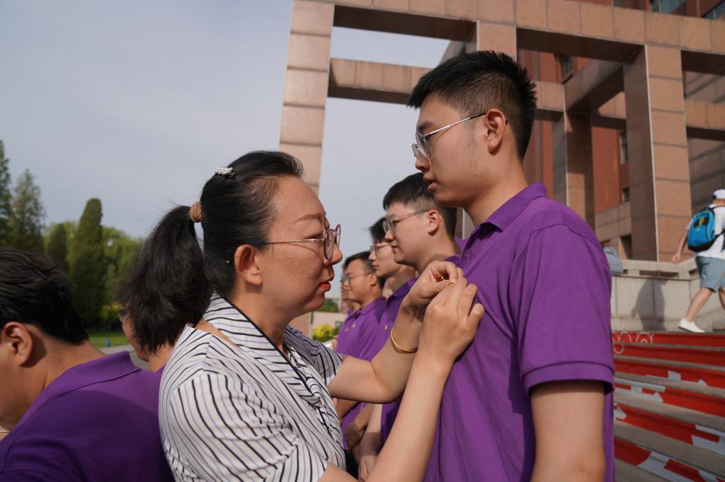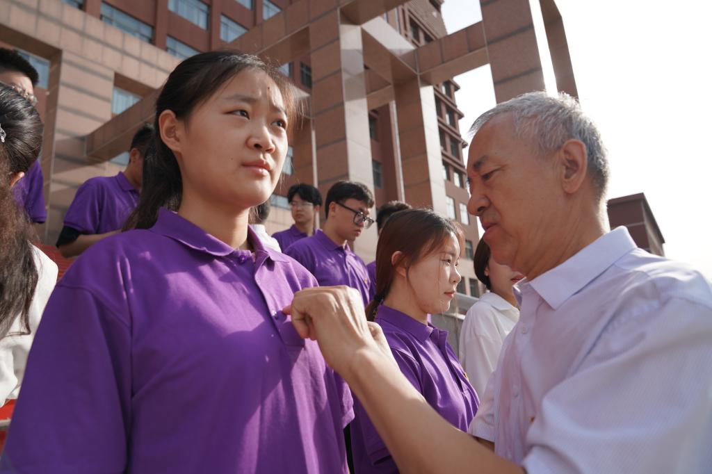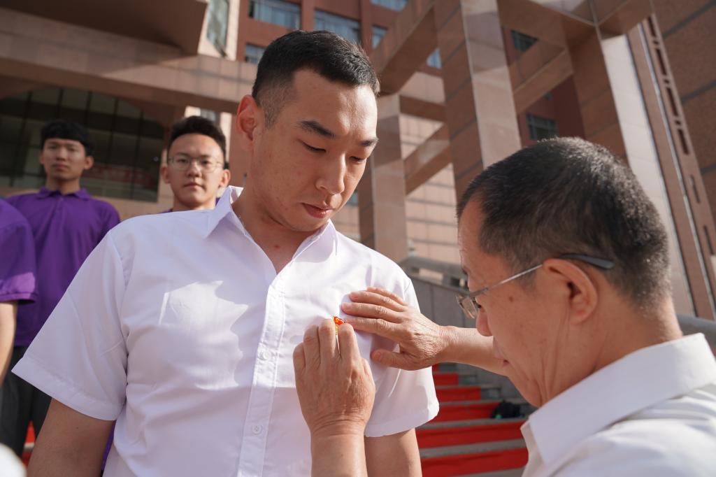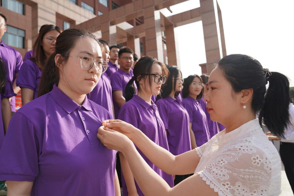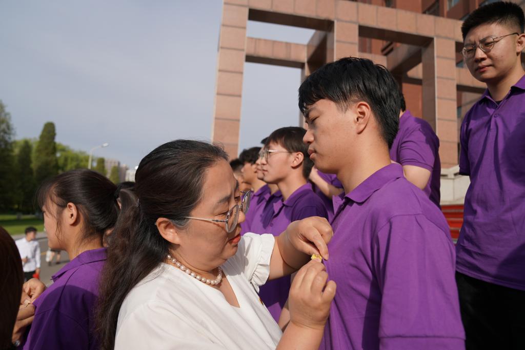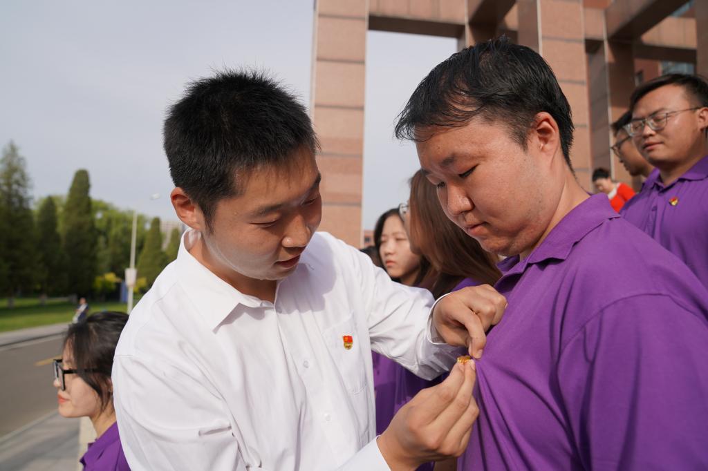 宣誓完毕后,教师党员为新入党同志佩戴了第一枚党徽。