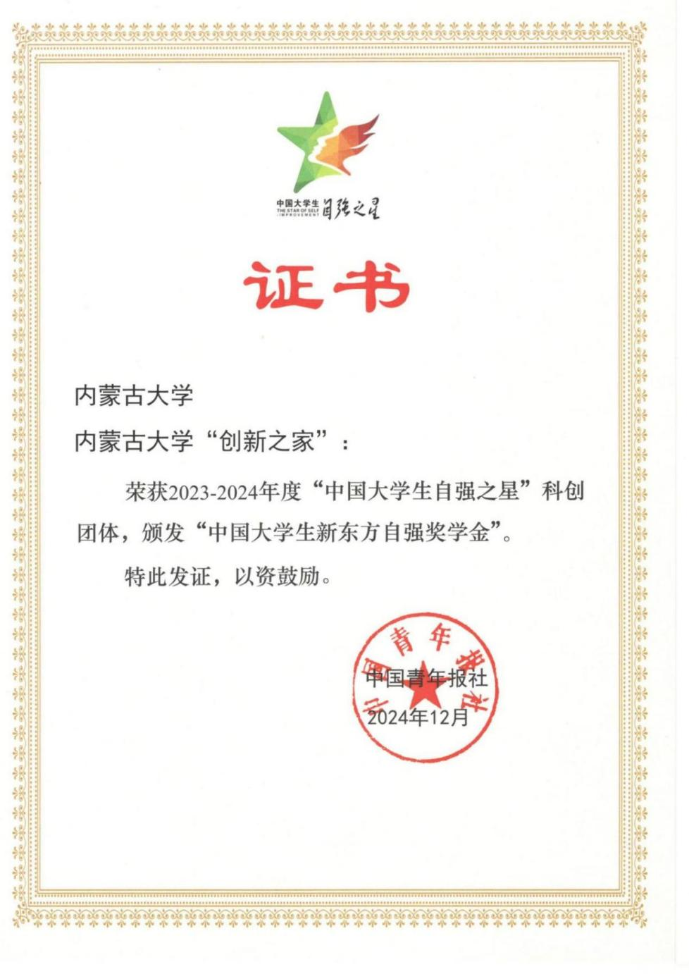 近日,由共青团中央、全国学联指导开展的2023—2024年度“中国大学生自强之星”奖学金评选结果揭晓。tyc86太阳集团“太阳集团‘创新之家’团队”获评2023—2024年度首届“中国大学生自强之星”科创团体,全国仅有100个大学生创新团队获此殊荣。