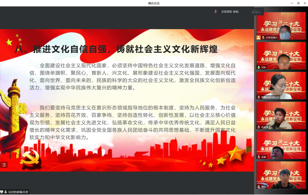 会上,吴岩老师带领与会人员认真学习了党的二十大报告中“推进文化自信自强,铸就社会主义文化新辉煌;增进民生福祉,提高人民生活品质;推动绿色发展,促进人与自然和谐共生;推进国家安全体系和能力现代化,坚决维护国家安全和社会稳定”等内容。