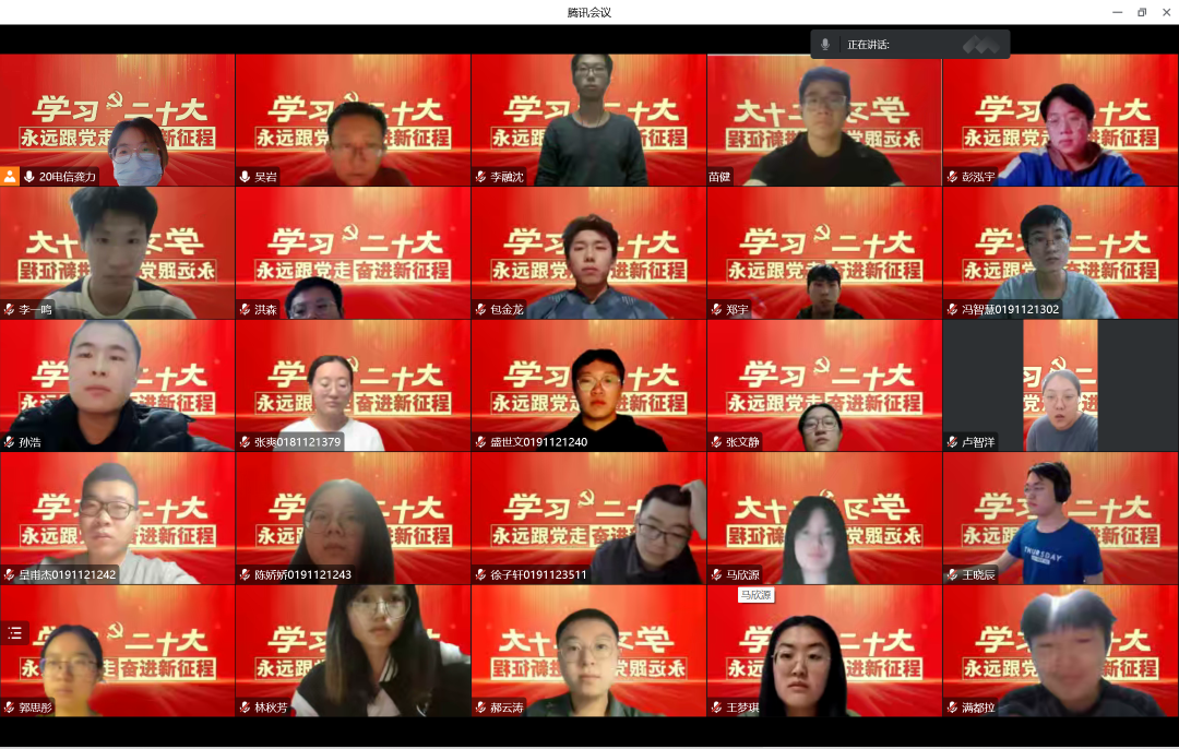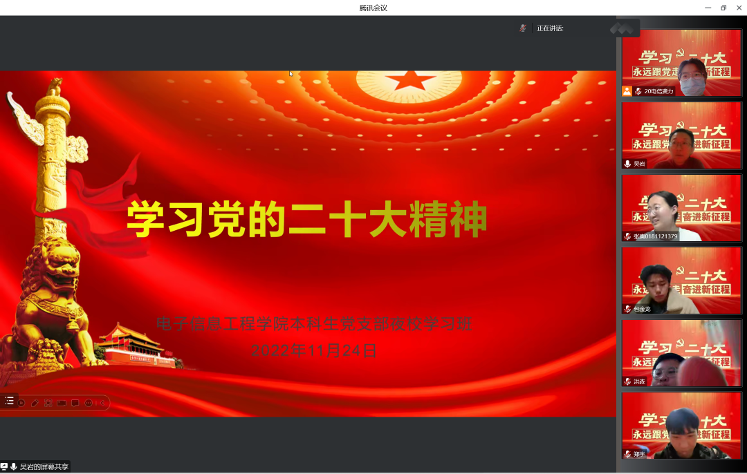 2022年11月24日晚20:00,tyc86太阳集团本科生党支部在腾讯会议开展二十大精神专题夜校第四期学习活动,本科生党支部书记吴岩主持会议,全体本科生党员参加会议。