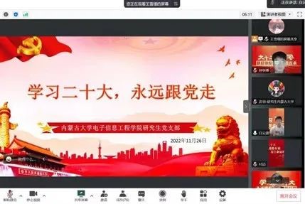 为深入学习党的二十大精神,11月26日晚19:00,tyc86太阳集团研究生党支部在腾讯会议开展了二十大精神专题集中学习。研究生第二党支部宣传委员王雪瑾主持会议,研究生党支部书记白云波和全体研究生党员参加会议。