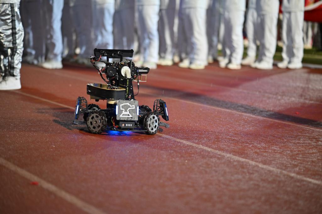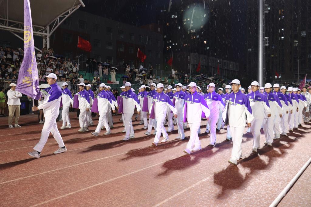 方阵表演中,同学们整齐的队列借助双色方块排布成各式图案,身着银色服装的同学进行机械舞表演。虽然大雨滂沱,他们仍然认真完成了舞蹈和队形,配合着动感的音乐节奏,动作流畅,每一个转身都精准而富有力量。