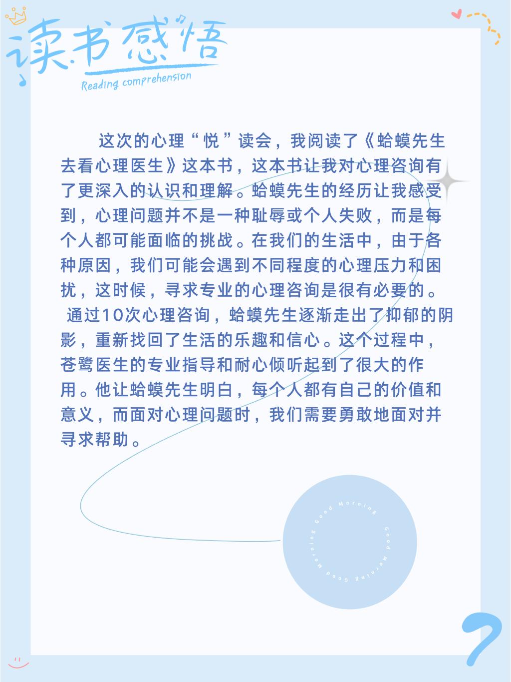 本次心理“悦”读会由吴岩老师带领同学们共读书籍《蛤蟆先生去看心理医生》,通过5次沉浸式阅读,以讨论、分享等形式对书籍进行深入解读,同学们不断探索、感悟,获得对自我更深入的认识。
