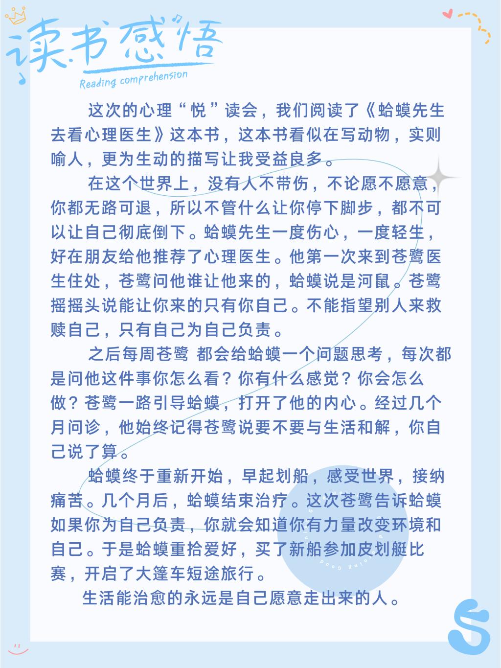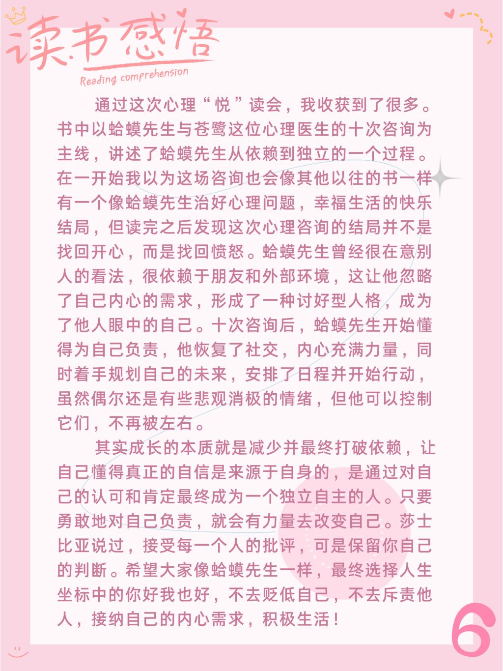 让我们看看参加本次心理“悦”读会的同学们都有什么收获与成长吧!