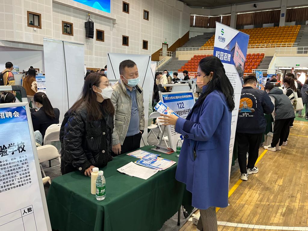 学院党委书记萨奇尔在招聘会现场与用人单位交流