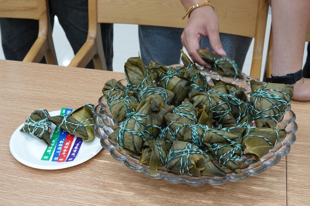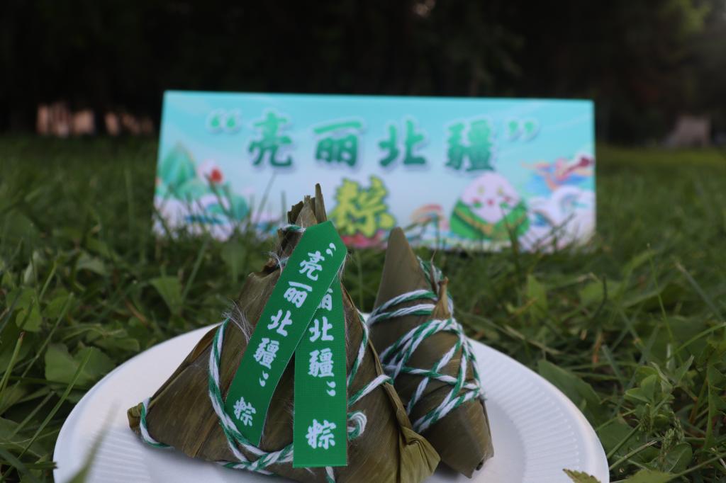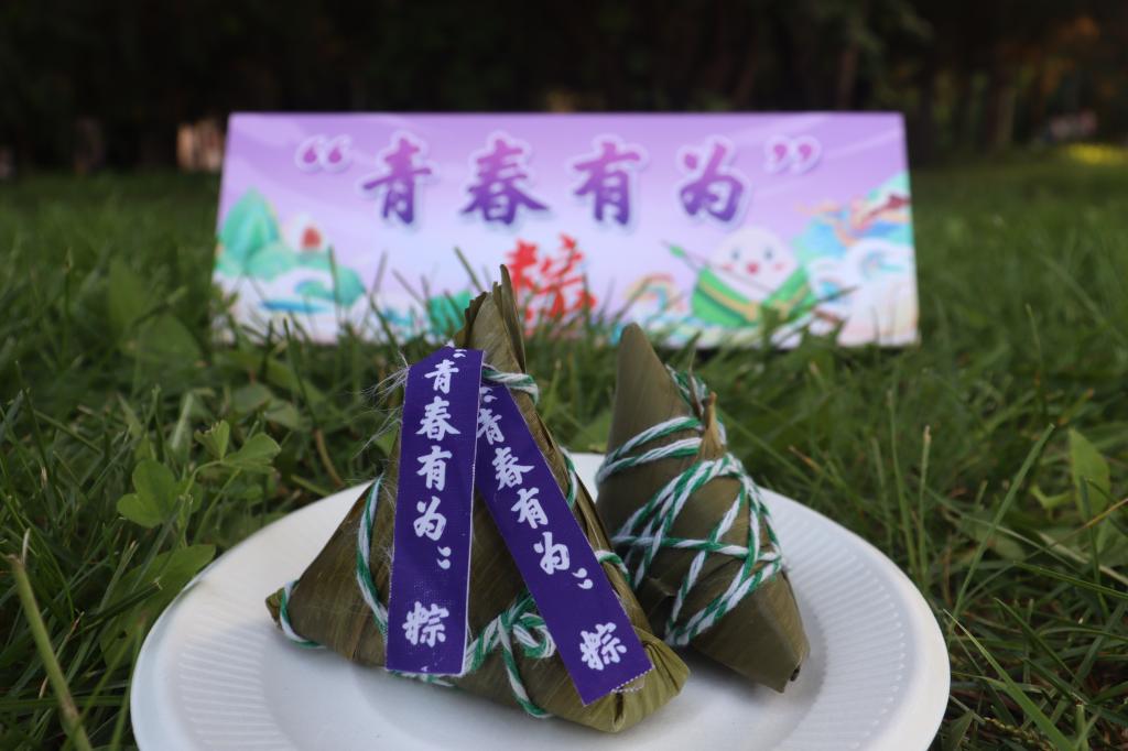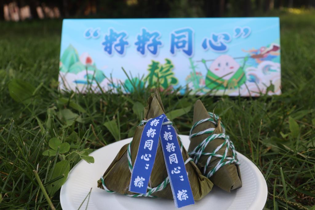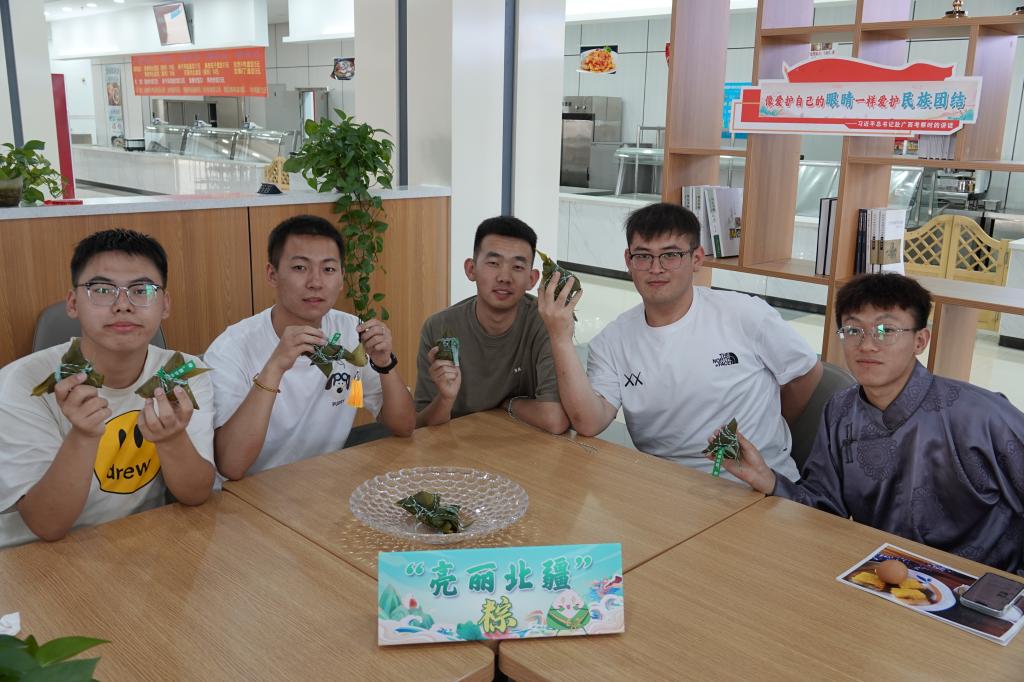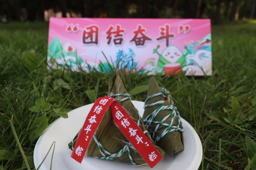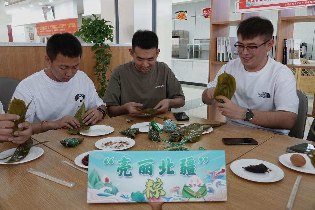 铺粽叶、填糯米、放粽馅、扎线绳,一个个“籽籽同心”粽、“团结奋斗”粽、“青春有为”粽、“亮丽北疆”粽在同学们的手中诞生。粽子形状各异,有的松松散散,有的棱角分明,一根根细绳包裹着华夏传承千年的味道,一个个粽子散发着团结友爱的芬芳。