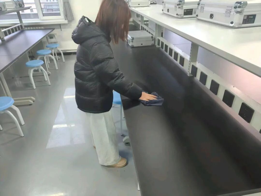 活动当天,支部党员们带着扫帚、抹布、整理箱等工具早早集合,在实验室管理老师的现场指导下,迅速展开工作。垃圾清扫重点攻坚地面杂物和卫生死角,从实验台底到墙角缝隙逐一清理,采用“干擦去浮尘、湿擦除污渍”的方式,对操作台、仪器表面进行全方位擦拭。